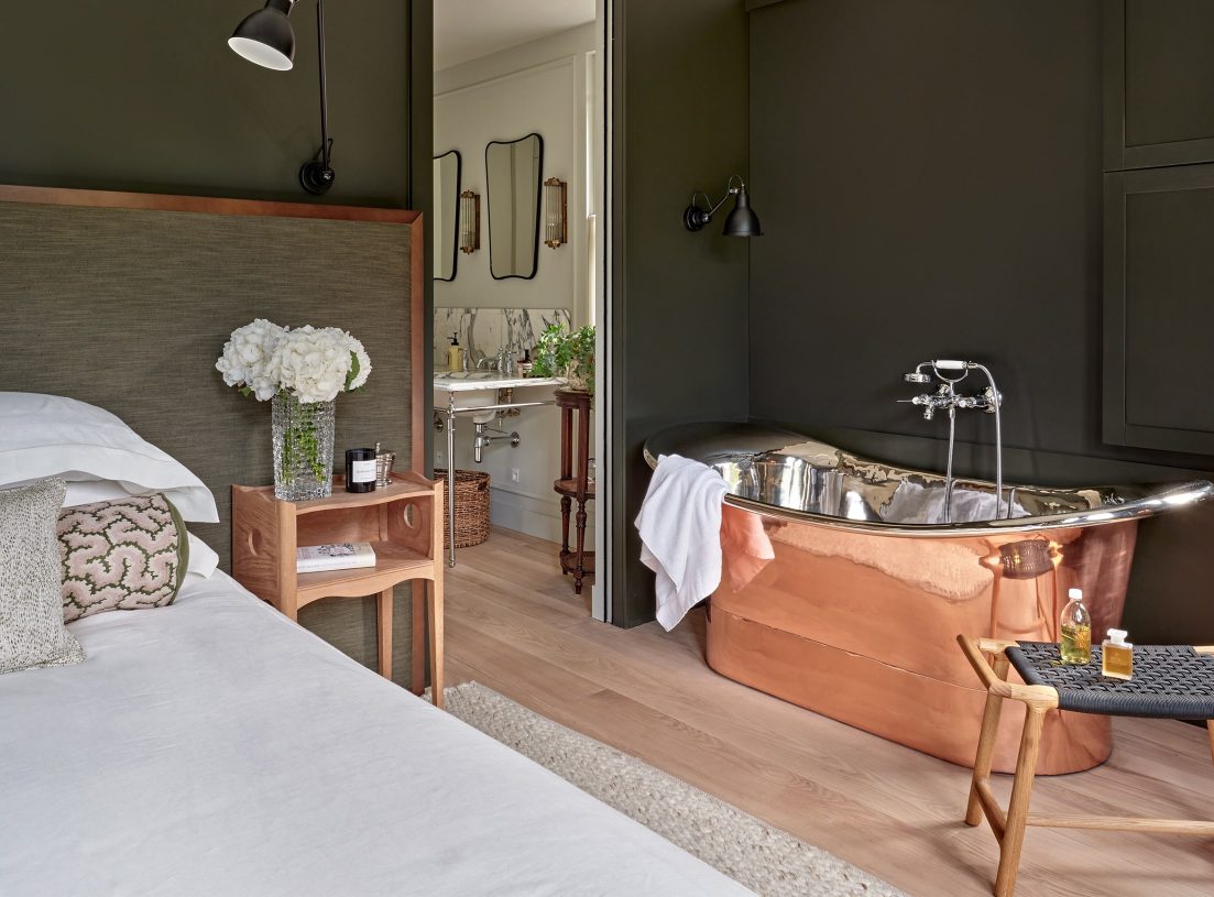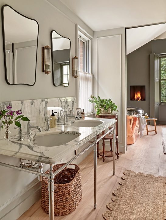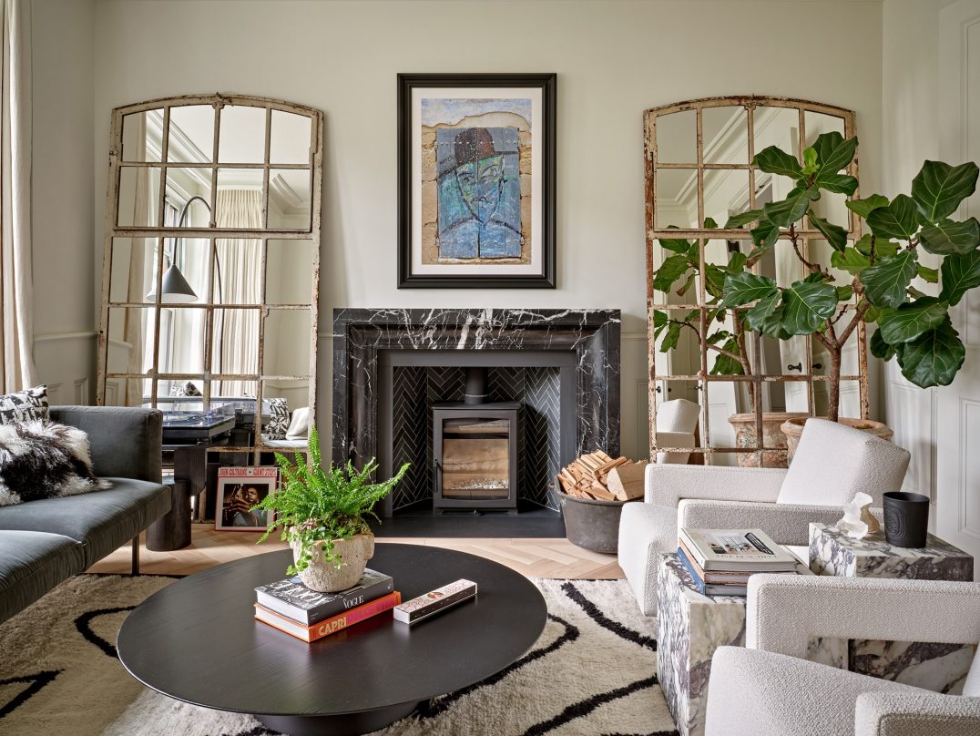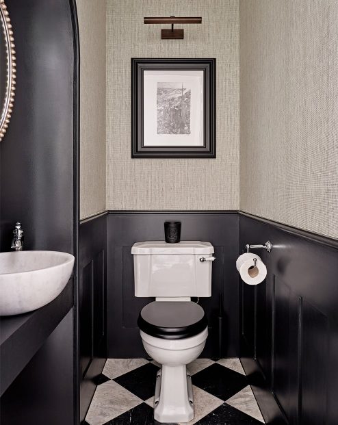The monochrome palette ensures cohesion throughout the property and enables modern pieces to sit comfortably with elegant antique furniture.