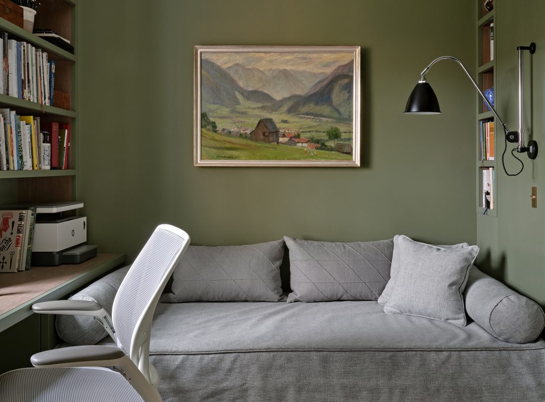 In the new primary dressing room, which pairs as a study, a stylish day bed allows for that extra guest to always feel welcomed.