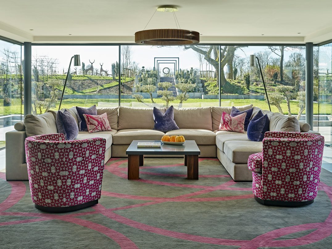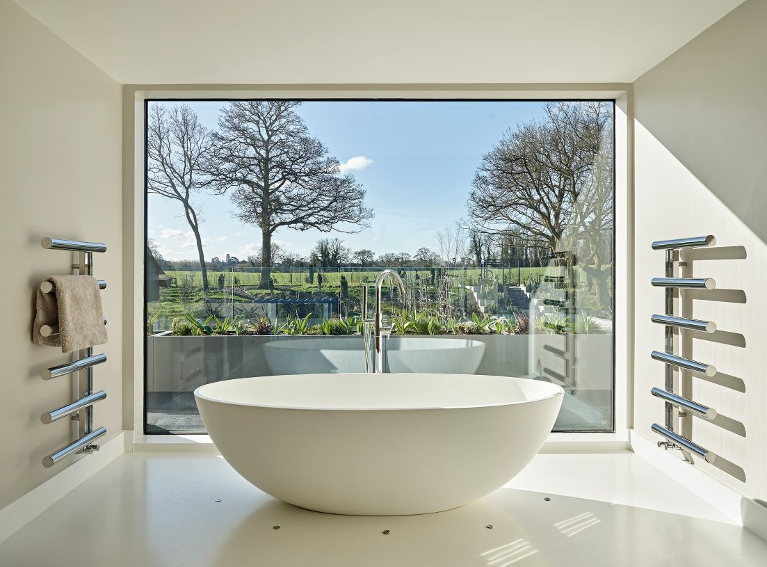 The dramatic glazing allowed us to unite the interior with the beautifully landscaped gardens. We created extra opportunities to enjoy this view – such as the placement of the master bathtub - so the owners can appreciate the full extent of their home.